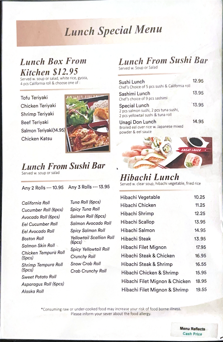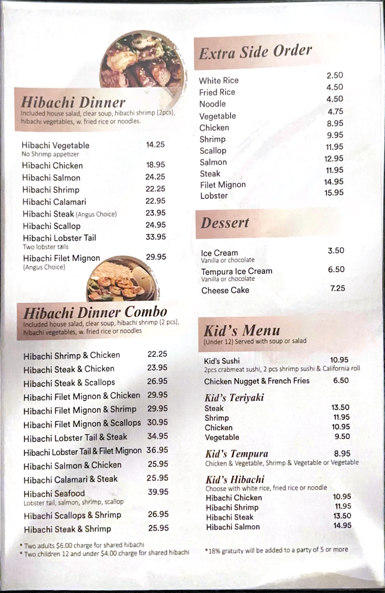 Guests often enjoy classic rolls like the California Roll or Spicy Tuna Roll alongside heartier options such as Steak & Shrimp or Shrimp Fried Rice, perfect for a midday meal or an evening out. Light starters like Miso Soup and Side Salad with Ginger Sauce complement the main dishes, adding refreshing contrast to the savory flavors.